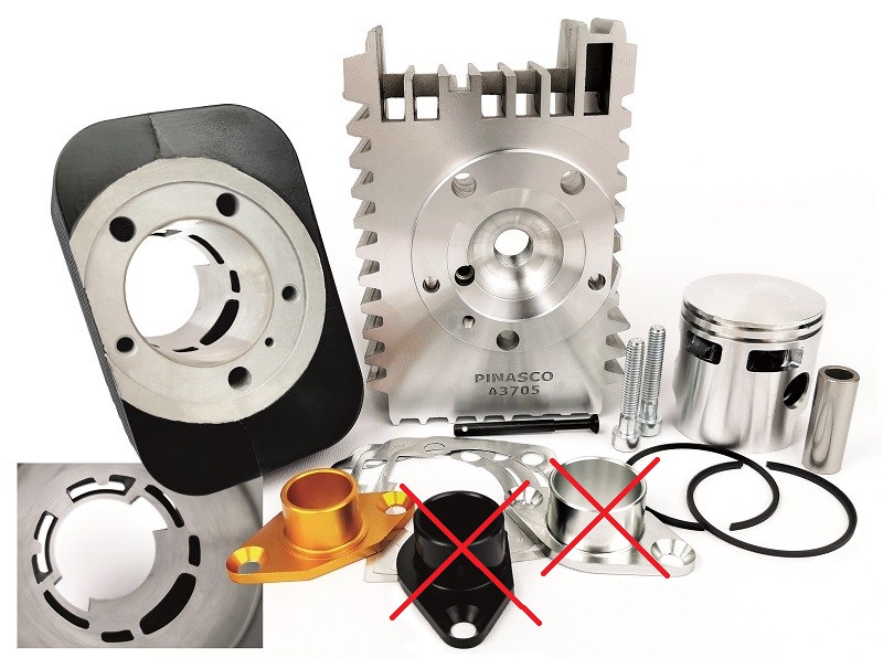 Standardno dolazi s ispušnim adapterom i Pinasco usisnim kolektorom s prirubnicom od 22 mm, što omogućuje fleksibilnost i optimalan protok ispušnih plinova. Glava cilindra ima centralno postavljen otvor za svjećicu i pričvršćena je s 5 točaka pričvršćivanja (3 navoja + 2 dodatna vijka), što sprječava curenje u komori za izgaranje i osigurava stalnu kompresiju.
