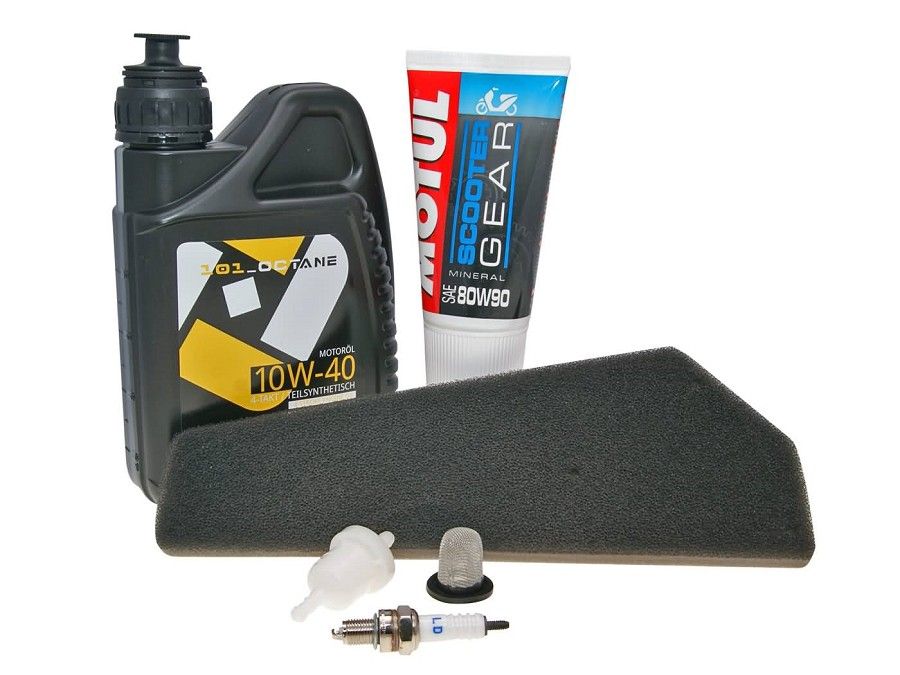 Set sadrži sve potrebne potrošne dijelove i maziva za pregled skutera.