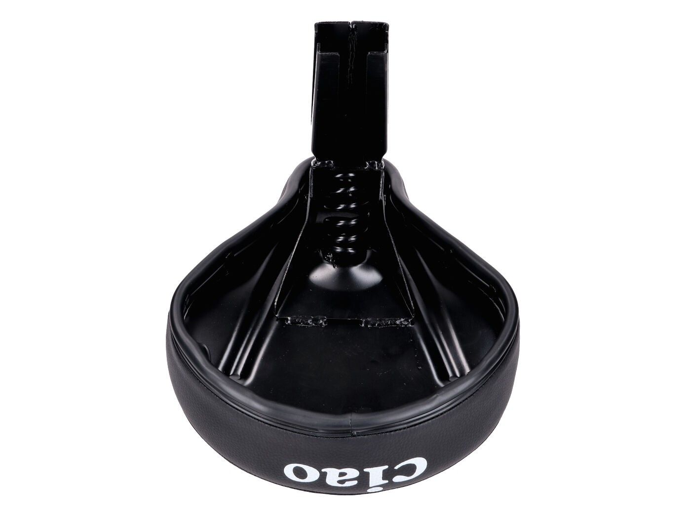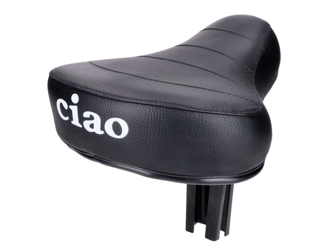 Prošiveno sjedalo s oprugom i bijelim natpisom Ciao na crnoj umjetnoj koži. Prikladno za mopede Piaggio Ciao i Vespa Ciao. Sjedalo ima četvrtasti držač za sjedalo!