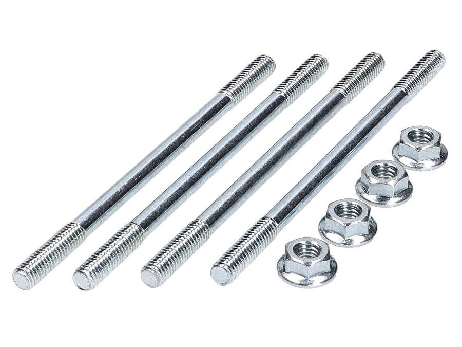 Brezone cilindra uključujući posebne matice s M6 navojem za cilindar pogodan za Piaggio motore, Puch Maxi, X30 i druge modele s M6 cilindričnim vijcima. Isporučuje se set s 4 vijka i 4 posebne matice. Vijci su dugi 107 mm, matice imaju kragnu.